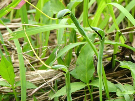 首をもたげた蛇やかまきりのように見えるからすびしゃく。