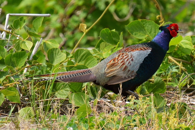 メスは全体的に茶褐色をしていますが、オスは目の周りに赤い肉腫があり、深緑色を主色とした長く華麗な羽をもっています。