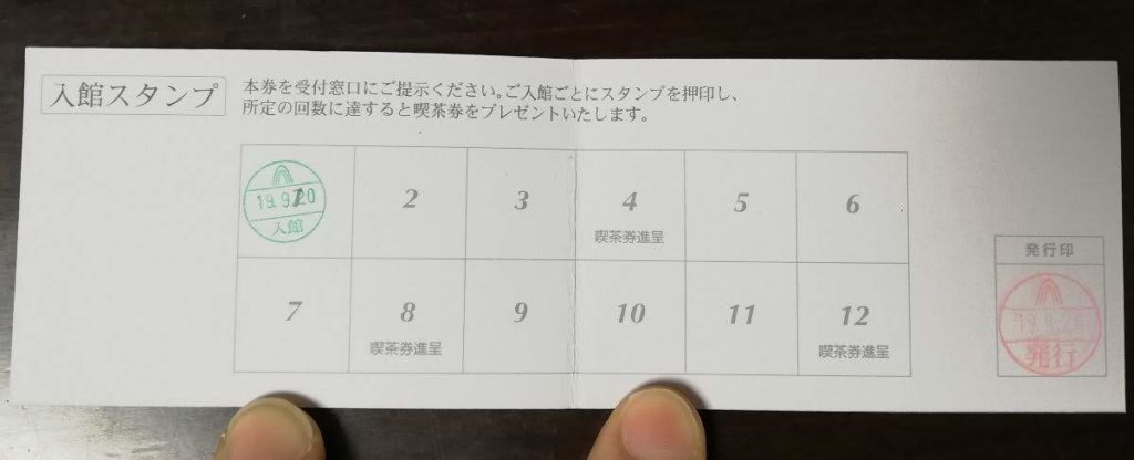 入館の旅にスタンプが押され、4回ごとに喫茶券をいただけます。