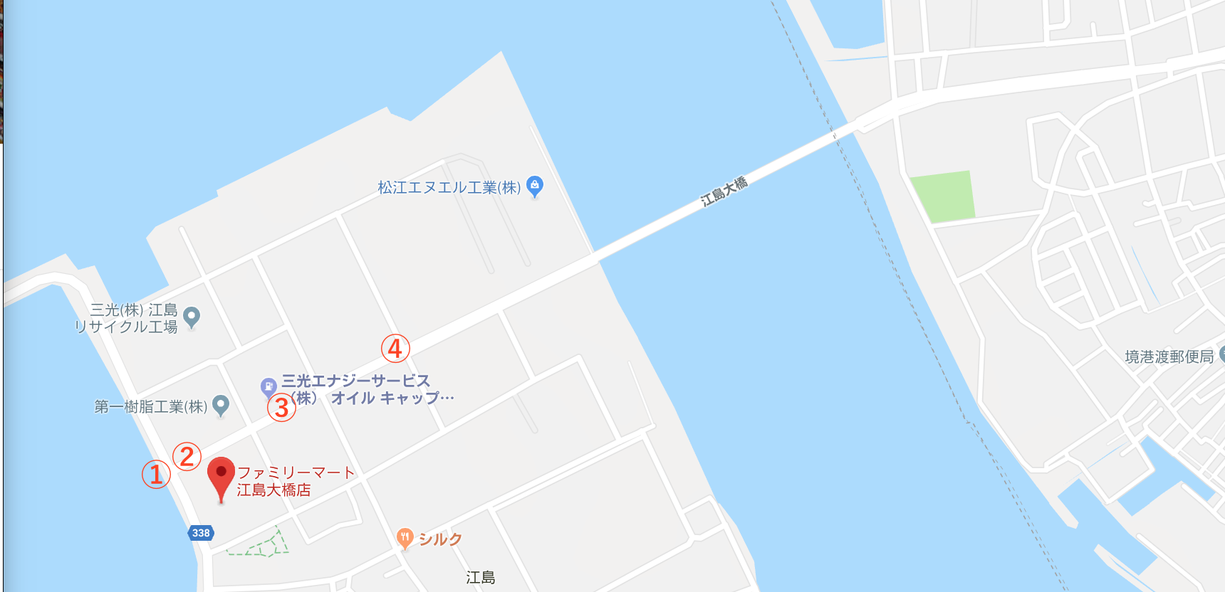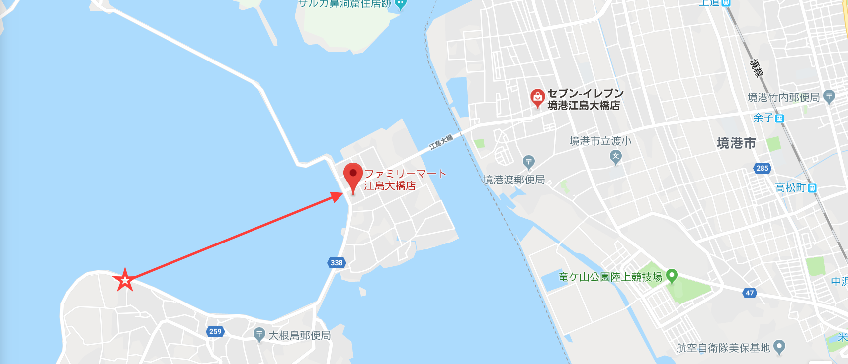 ベタ踏み坂(江島大橋)はgoogle mapで登録されていないため、近くのファミリーマートの位置を記しています。