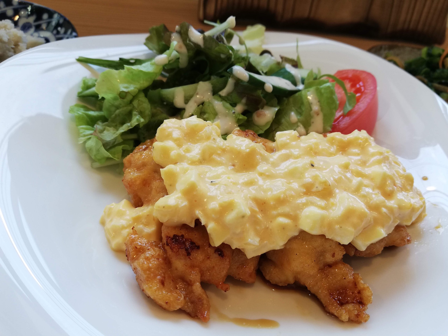チキンの甘い照り焼きのようなソースとタルタルソースがめっちゃ合うんだけど、特にソースの中のらっきょうが程よい酸味とシャキシャキした食感で口の中を盛り上げてくれるんです。美味!