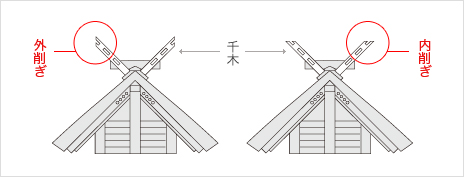 千木の外削ぎと内削ぎについては、こちらの画像がわかりやすいです。