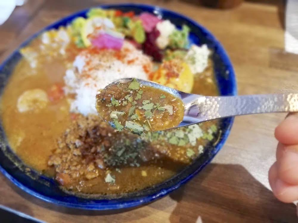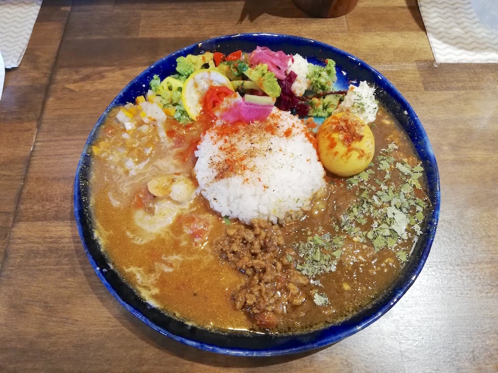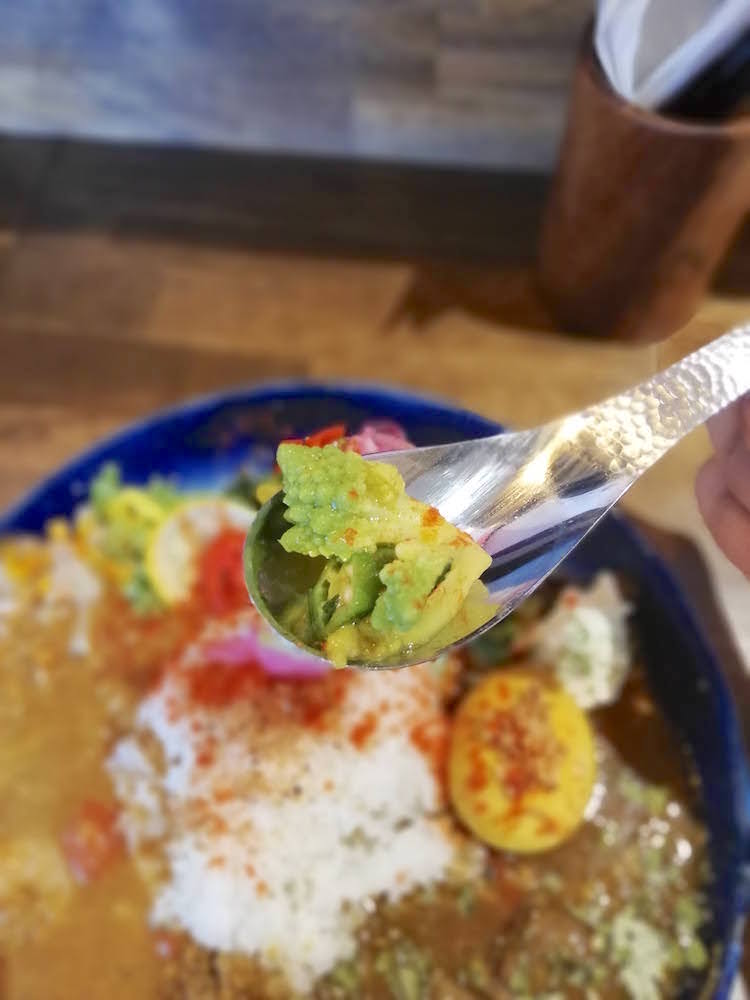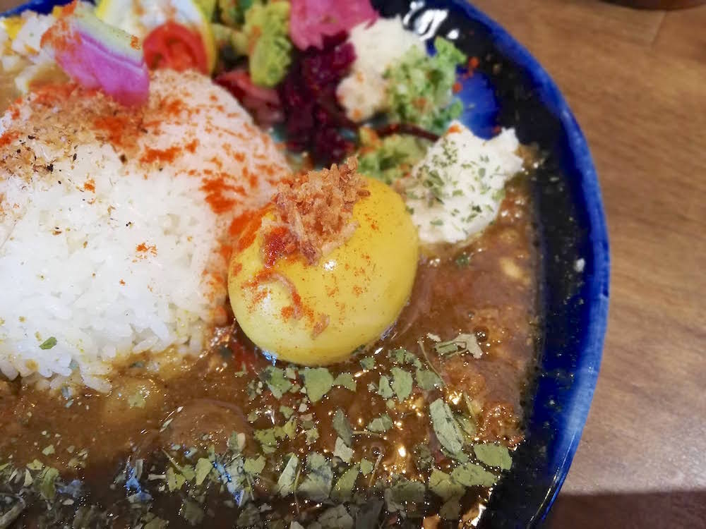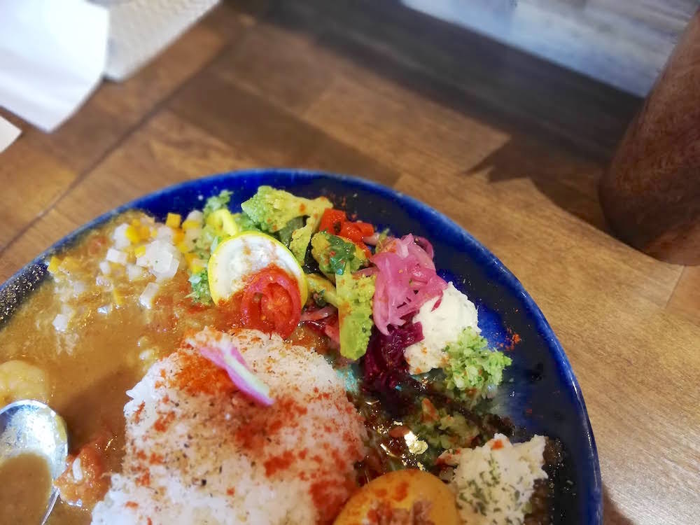 今回は店長おすすめの3種あいがけcurryにスパイスたまごをトッピングしてオーダーしました。