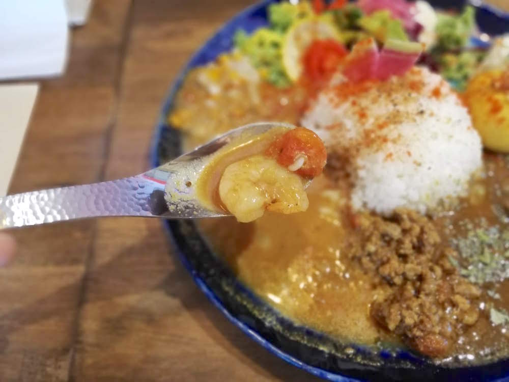 カレー自体はトマトの旨味が凝縮されており、エビと一緒に口に入れるとココナッツの香りがふんわり鼻腔を駆け抜けます。