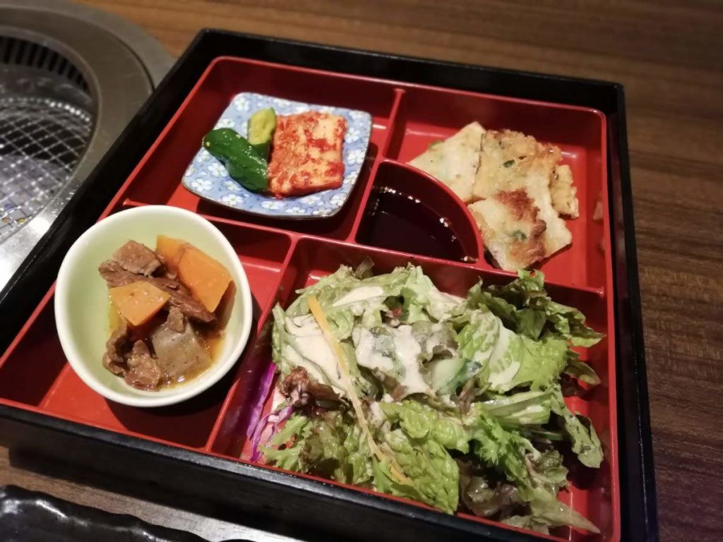 お重の中にはサラダ、お肉の入った煮物、キムチ、チヂミが並べられています。