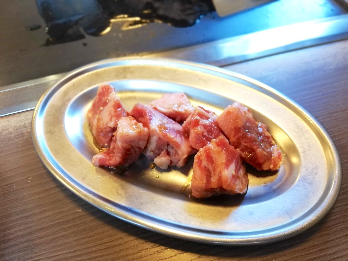 お好みやもんじゃができるまでは、並行して隣の鉄板で焼き上がったお肉をほうばります。