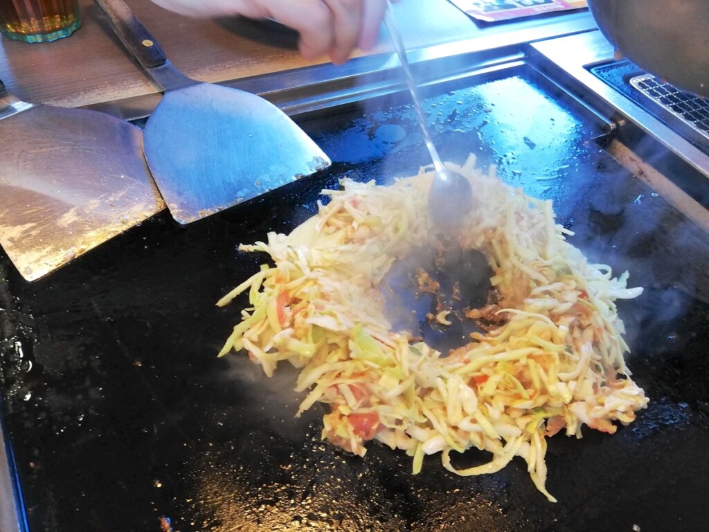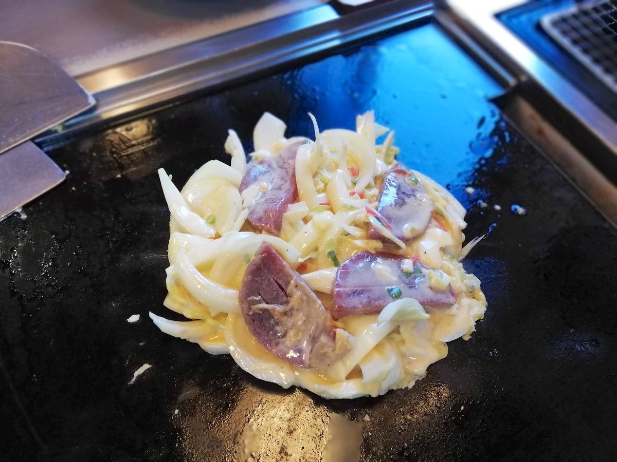 注文したのはご当地お好みの牛タンネギ玉と、もち明太チーズのもんじゃ焼き。