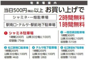 以下提携駐車所では、シャミネで500円以上の買い物をすると、提携駐車場の無料チケットをいただけます。