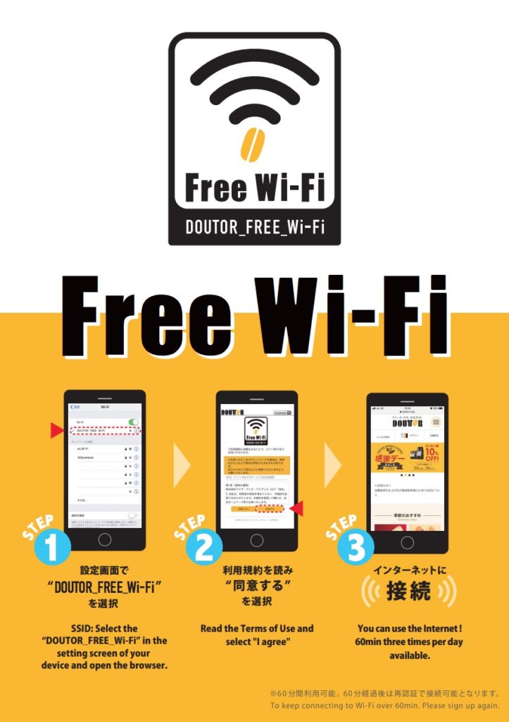 もちろん、ドトール全店舗でも無料wifiが使用可能です。