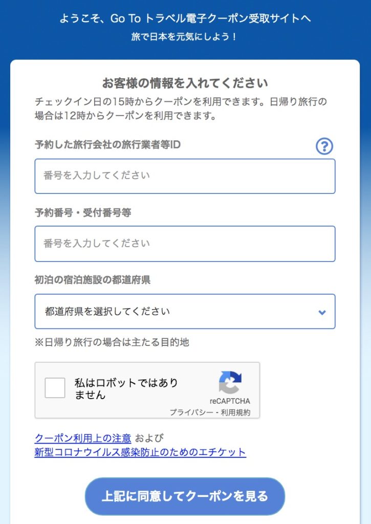 代表者の方が電子クーポンサイトにアクセスし、旅行会社等から案内された以下の情報を入力することでクーポンが発行されます。