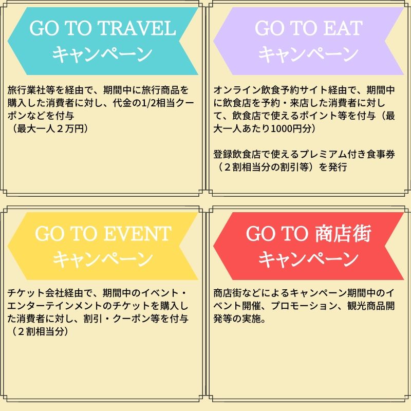 GO TO キャンペーンでは、Travel(旅行)、Eat(飲食)、Event(イベント)、商店街の4つの分野でそれぞれキャンペーンが行われます。