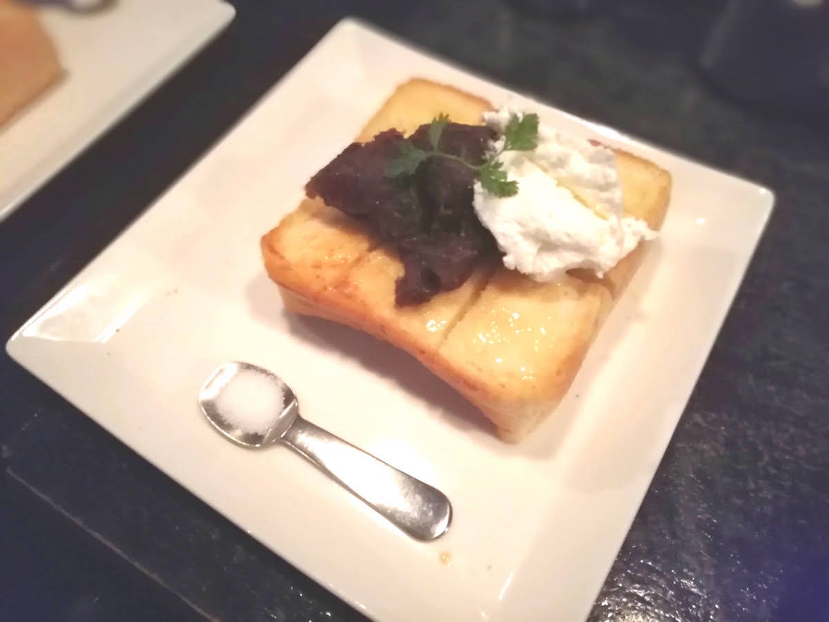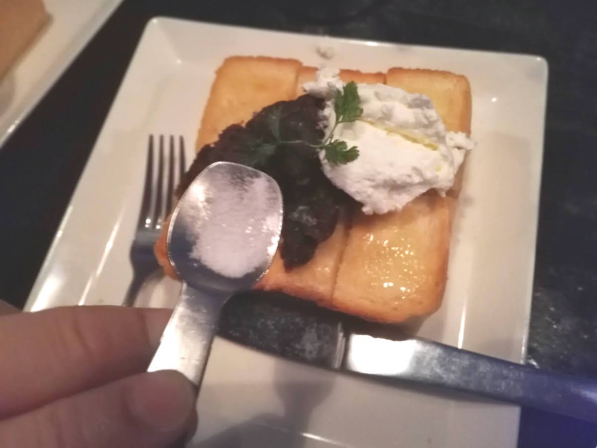 ナイフでトーストを切り分けて、ホイップとあんを好みの具合にのっけていただきます。