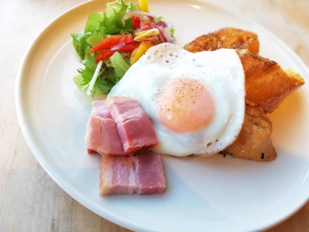 目玉焼きとベーコン、サラダとバランスよく配置されています。