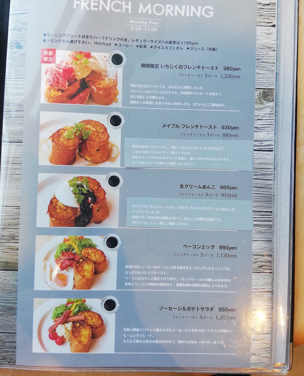 9:00〜11:00のモーニングは5種類のフレンチトーストから選択ができます。