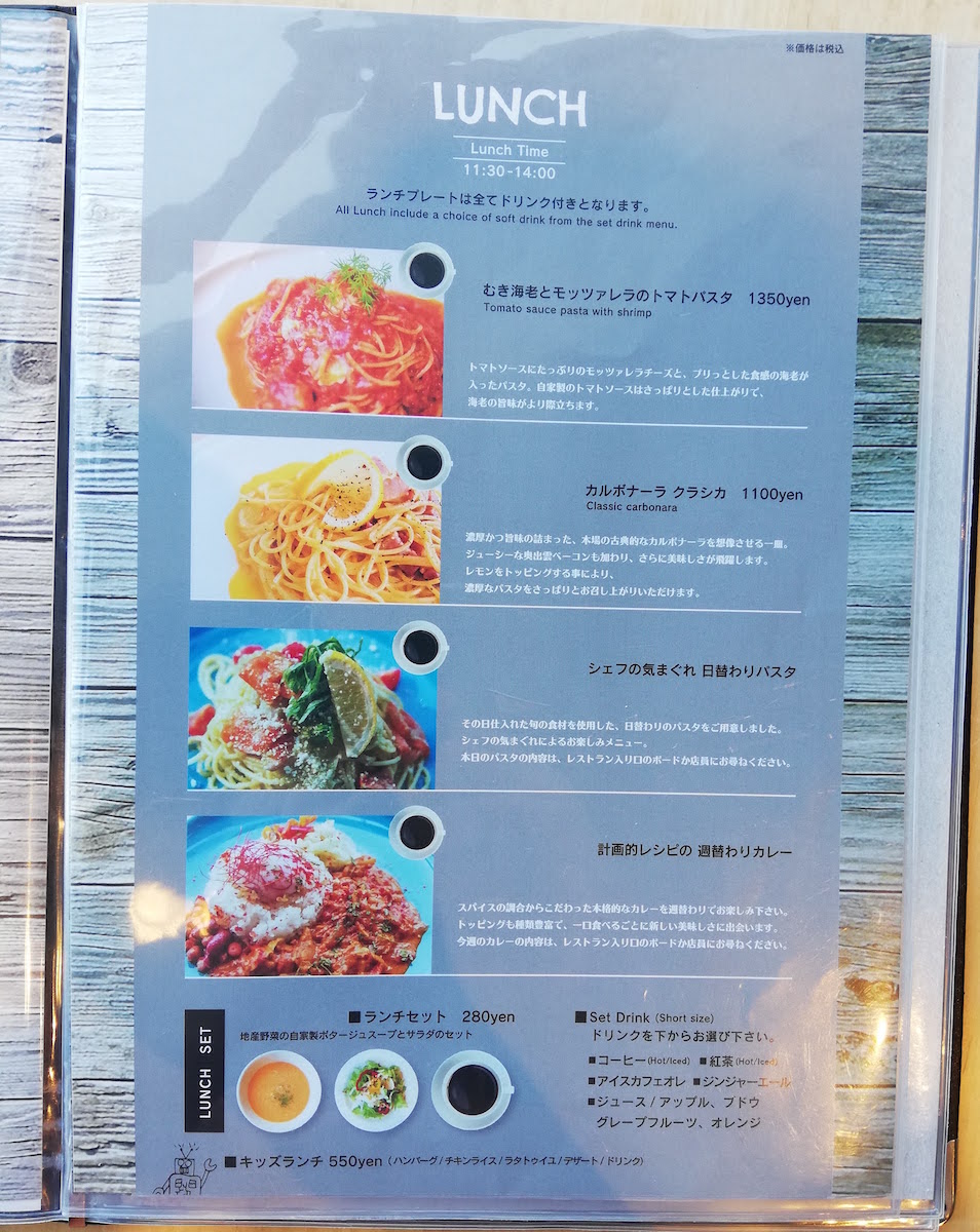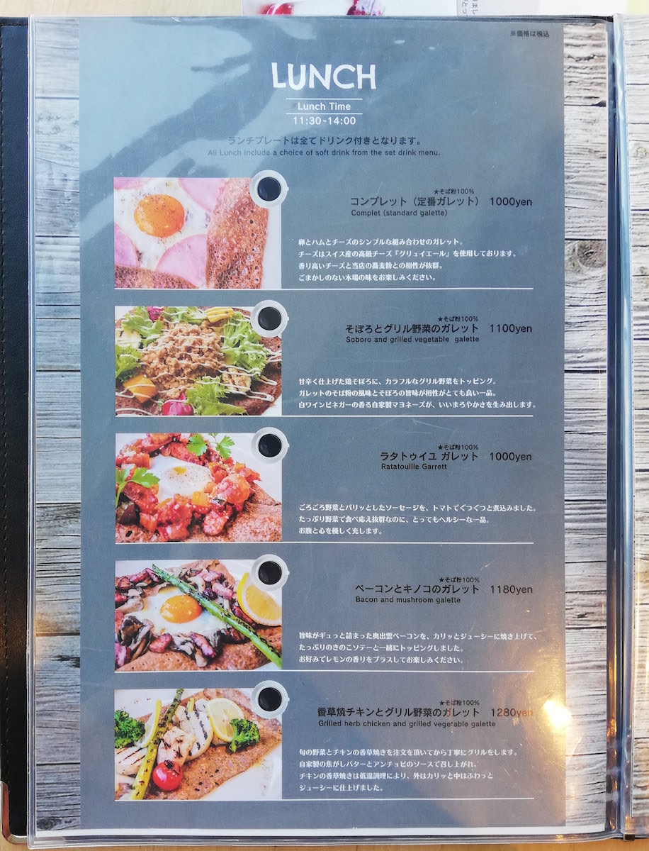 11:30~14:00のランチタイムは各種ガレットと、パスタやカレーも。