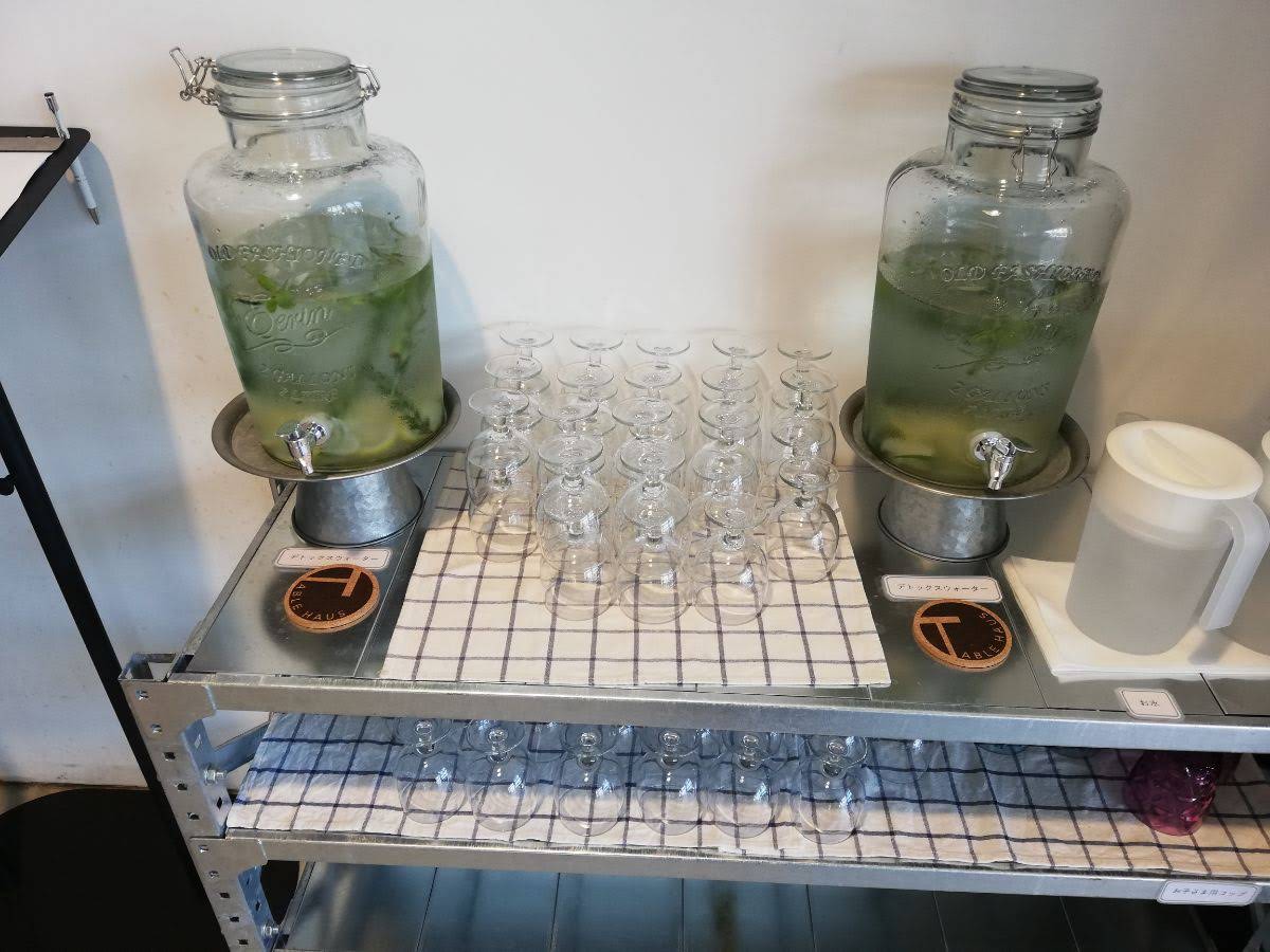 デトックスウォーターと書かれたウォーターサーバーの中を覗くと、レモンの他にミントやローズマリーなどのハーブがたっぷり入っていましたよ。