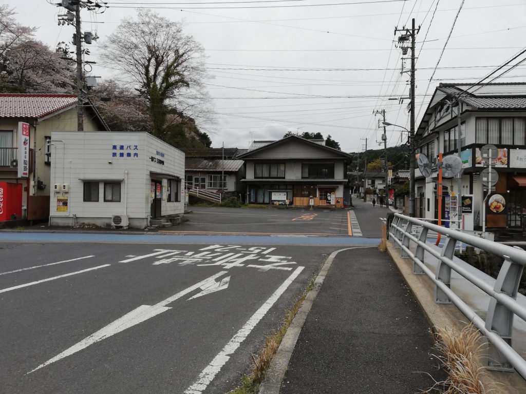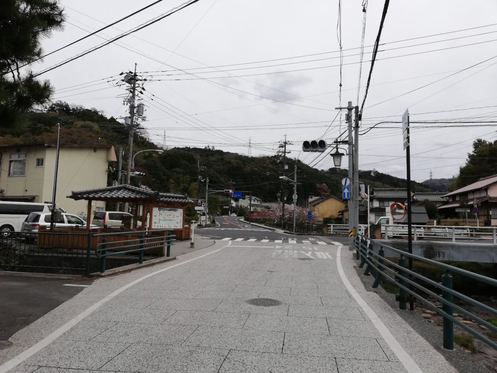 信号手前左側が湯薬師広場(温泉水を汲める場所)。