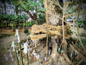 今回は大きなしめ縄で有名な神楽殿にていただきました。