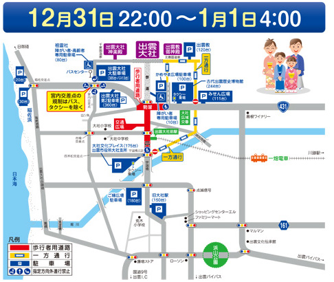 出雲大社で年越しをして初詣を目的とする方が集まるので、確実に混雑します。