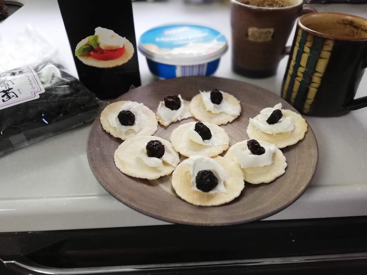 先ほどのクラッカーにマスカルポーネとレーズンを乗せた一品。(この時はレーズンだけ別のお店のものを使用)