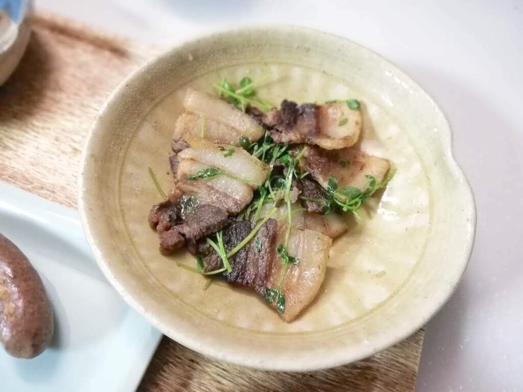 こちらはバラ肉を豆苗と炒めたもの。