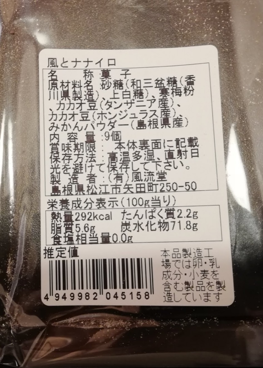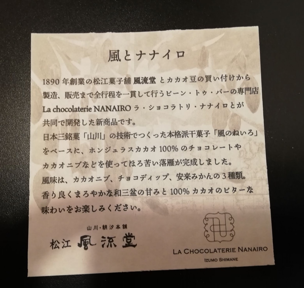 「風とナナイロ」は、松江の老舗和菓子店風流堂とカカオの買い付けから製造・流通まで一貫して行うビーン・トゥ・バーの[La chocolaterie NANAIRO] ラ・ショコラトリ・ナナイロのコラボ商品で2021年春限定です。