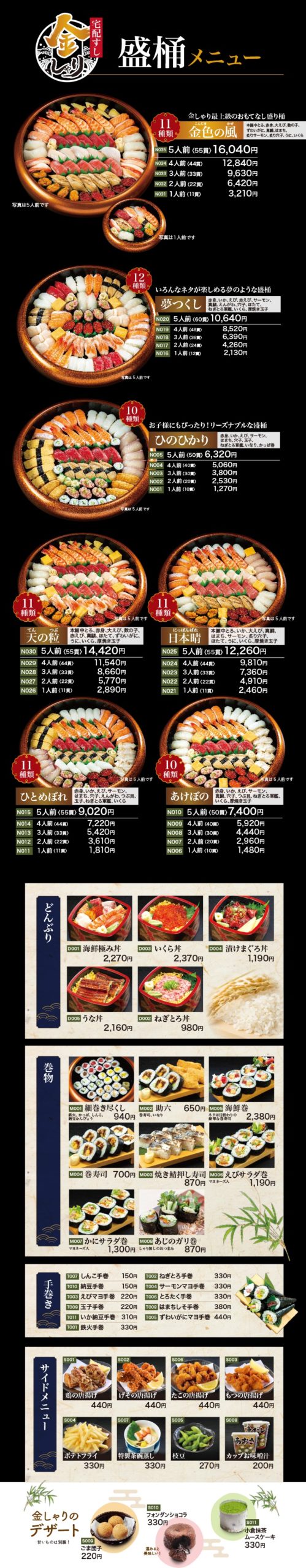 上記メニューの通り、桶寿司から、丼、巻物、サイドメニューやデザートまで充実しています。