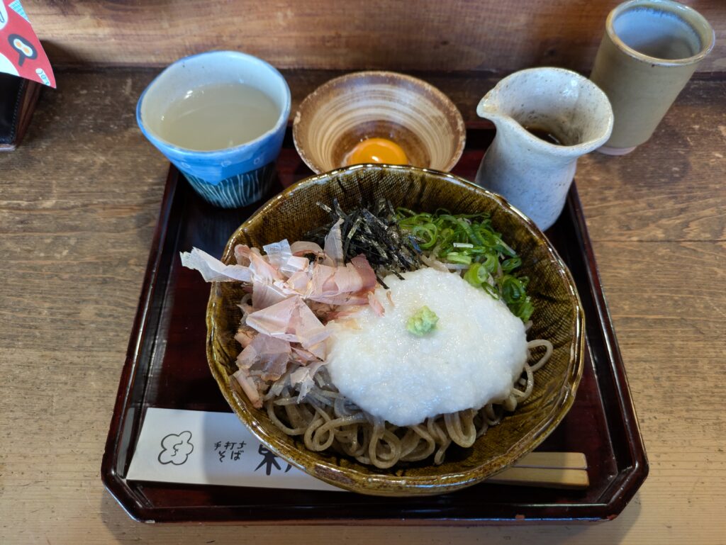 こんもりしたそばの上にとろろとかつおぶし、刻みのりにねぎ。