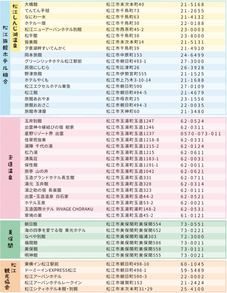 | 併用可能チケット | 宿泊時:しまねプレミアム宿泊券 日帰り旅行時:しまねプレミアム飲食券・松江GENKI夜市プレミアムチケット ※いずれもそれぞれのチケット対象施設のみ併用可能 |