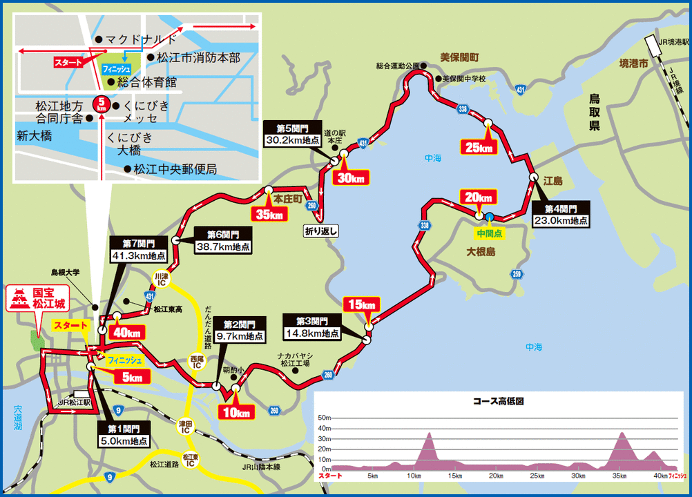 大根島を渡って、本庄方面を経由して松江市総合体育館に戻るコースです。