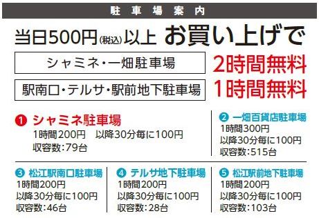 2時間無料となるシャミネ駐車場と畑百貨店松江店立体駐車場がおすすめです。