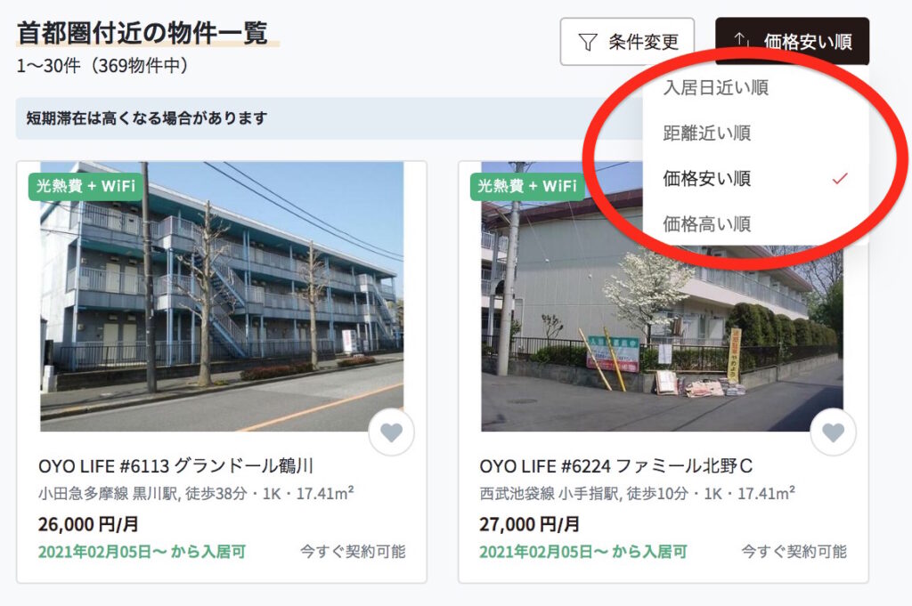 「価格高い順」以外にも「入居日近い順」「距離近い順」「価格安い順」などでソートすることが可能。