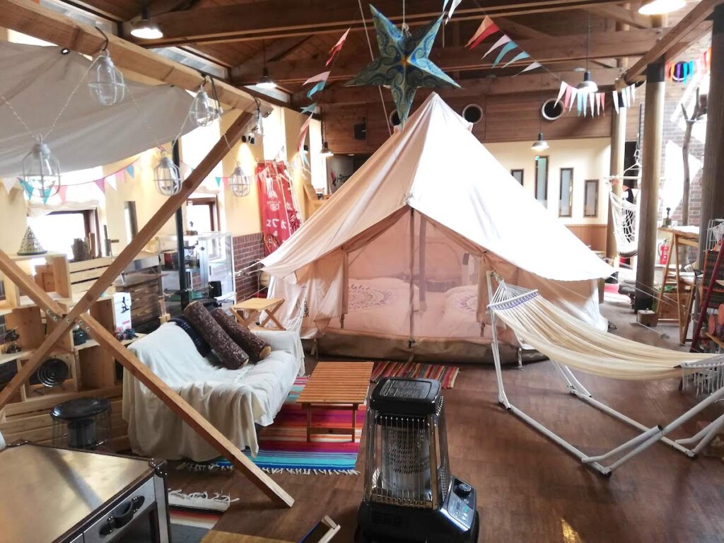 グランピングといえば手ぶらで大自然を味わえるものですが、屋根のある屋内スペースも結構大事だったりします。