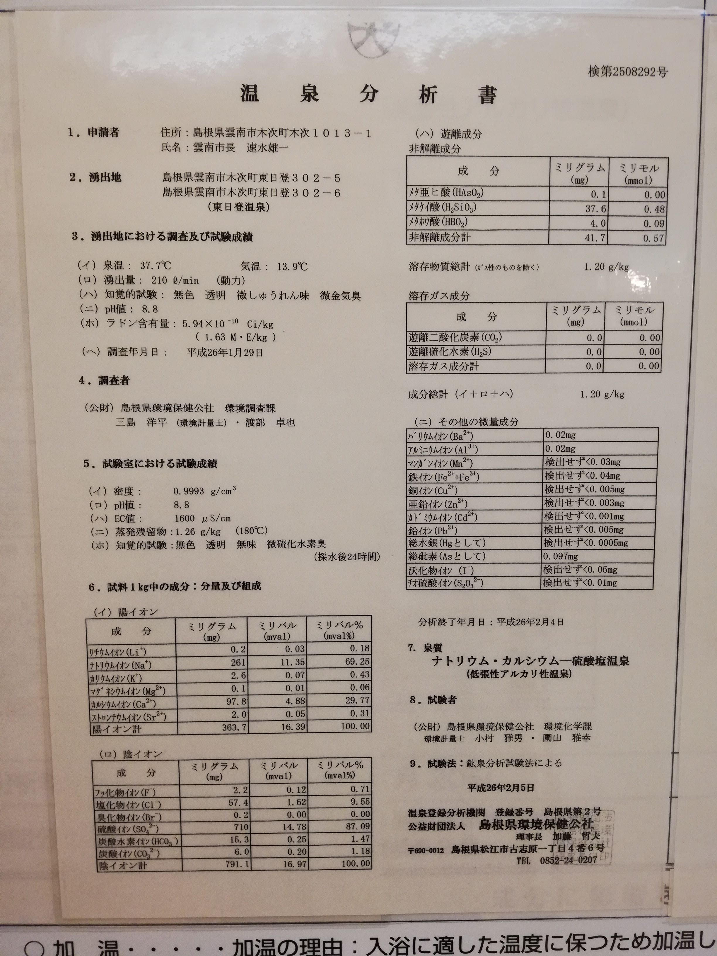 泉質はナトリウム・カルシウム―硫酸塩温泉(低張性アルカリ性温泉)。