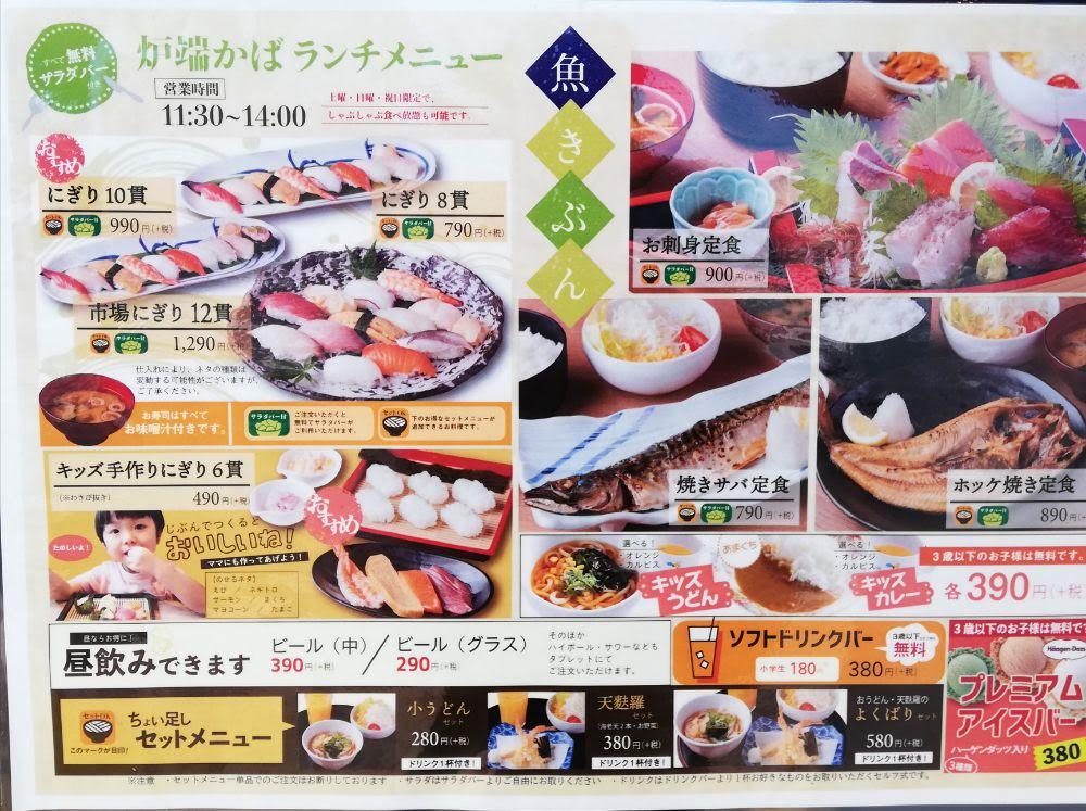 食の複合施設、コトリエットの炉端かばは、地元の食材にこだわりつつも、豊富なメニューで飽きさせないお店でした。