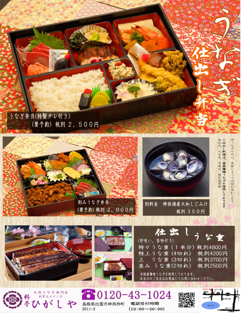 料亭ひがしや 出雲市神西沖町 ①(要予約)うなぎ弁当2500円,刻みうなぎ弁当2000円,神西湖産やまとしじみ汁350円