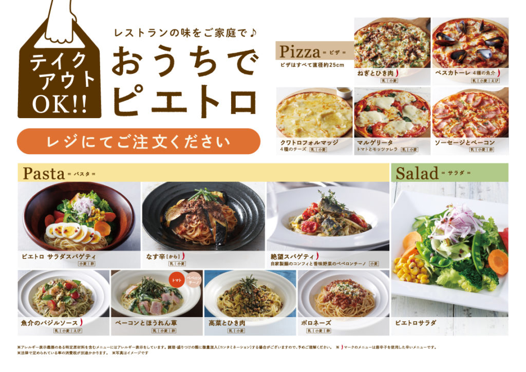その他、ピザ、パスタなどのテイクアウトメニューあり