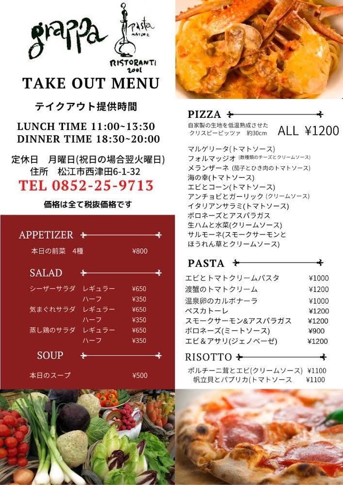 #出雲レガーレ #出雲イタリアン#テイクアウトのみの営業 #コロナウイルスが早く終息しますように #営業時間の変更 #乗り切りましょう こんにちは!レガーレです!早くコロナウイルスの感染拡大の縮小を願います! 予防の為、本日よりレガーレはテイクアウトのみの営業とさせて頂きます!メニューは画像になります! 営業時間‥11:00〜15:30  17:30〜19:00 ○連絡頂けると指定のお時間に作ります! ○各SNSからのご予約も可能です!メッセージお願いします! 0853-23-2533  レガーレ ご予約お待ちしております😀