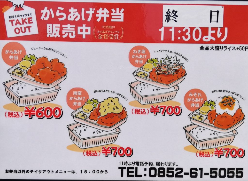 松江市御手船場町 ①唐揚げ弁当600円、南蛮唐揚げ弁当700円(税込)
