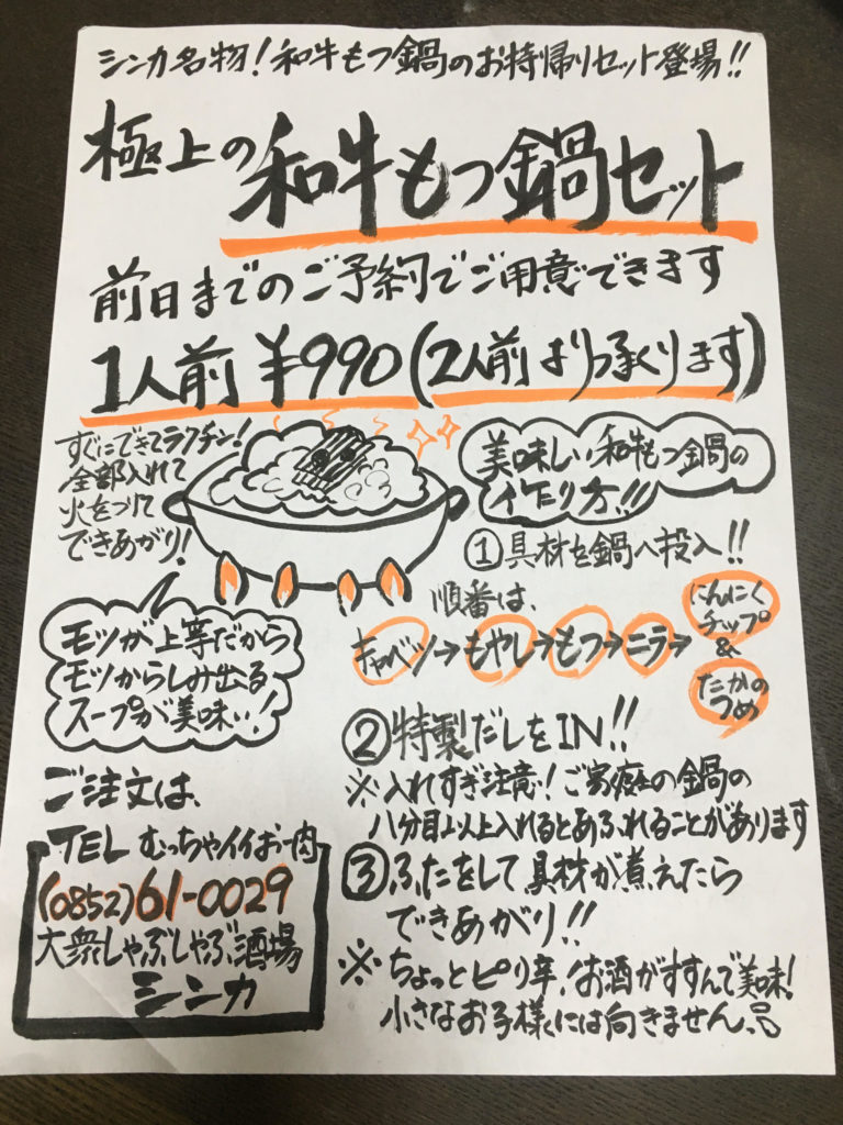 大衆しゃぶしゃぶ酒場シンカ 松江市末次本町 ①極上の和牛もつ鍋セット1人前¥990+税