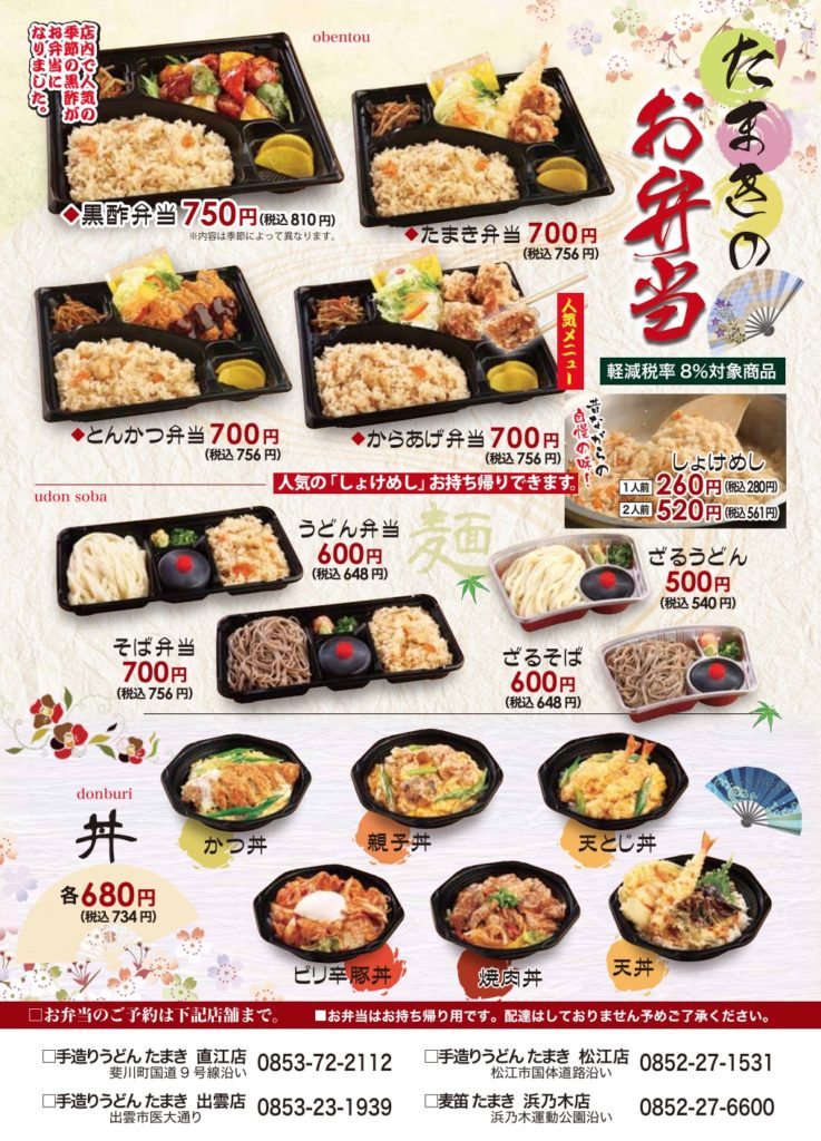 たまき浜乃木店 松江市浜乃木 ①下部テイクアウトメニューをご確認ください