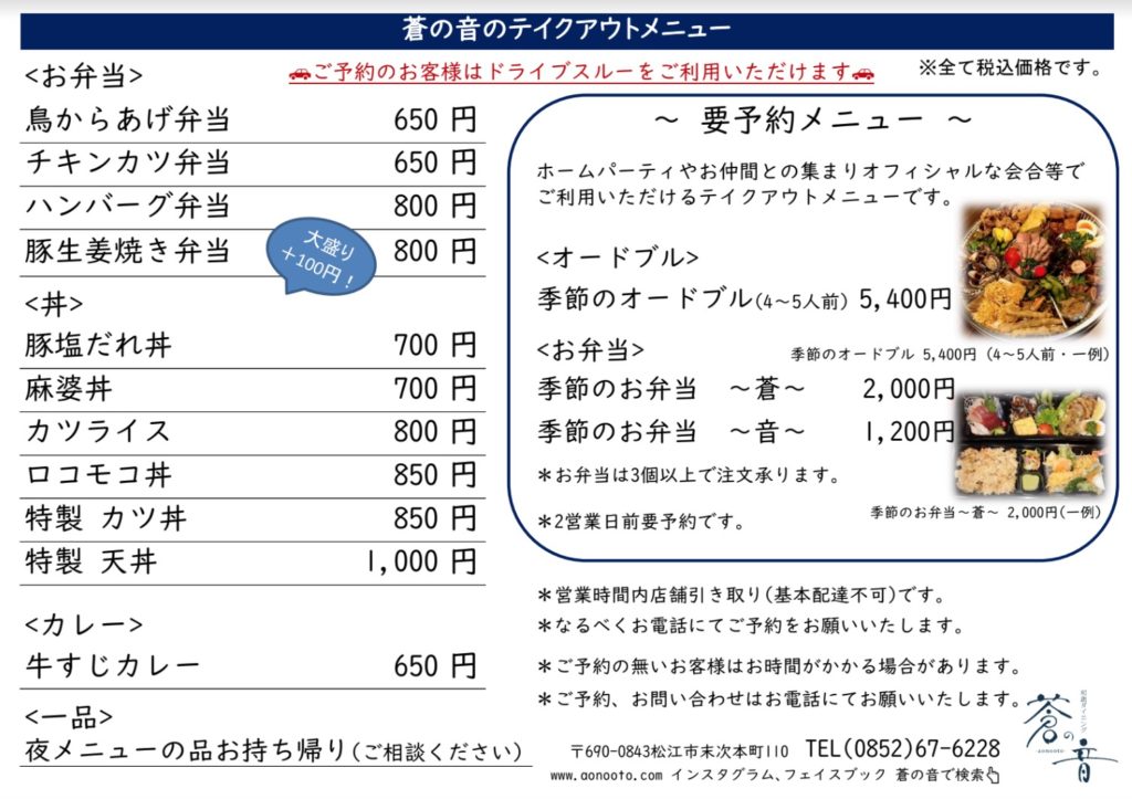 和創ダイニング 蒼の音 -aonooto- 松江市末次本町 ①お弁当、オードブル、夜メニューの品等②お値段、内容等ご相談ください。配達は個数によっては相談に応じます。