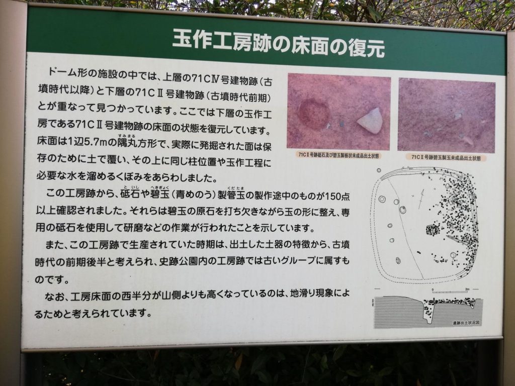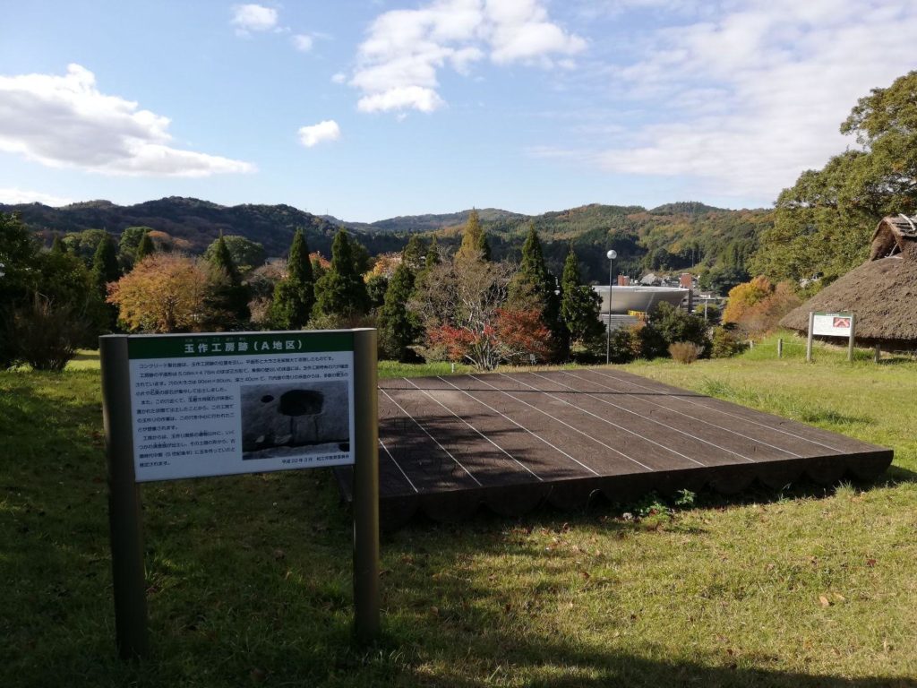 この地域は、1971年(昭和46)年の調査で古墳時代前期から平安時代にかけての約30棟の工房跡や未完成の勾玉が発見され、1974年に史跡公園として整備されました。