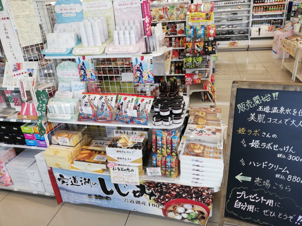 地元の商品コーナーには、玉造温泉のコスメショップ「姫ラボ」の商品や、「めのうの川島」の商品など。