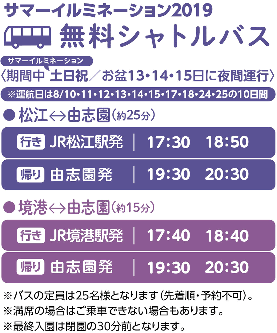 | 松江駅発時間(約25分) | 17:30、18:50 / 由志園発時間は19:30、20:30 |